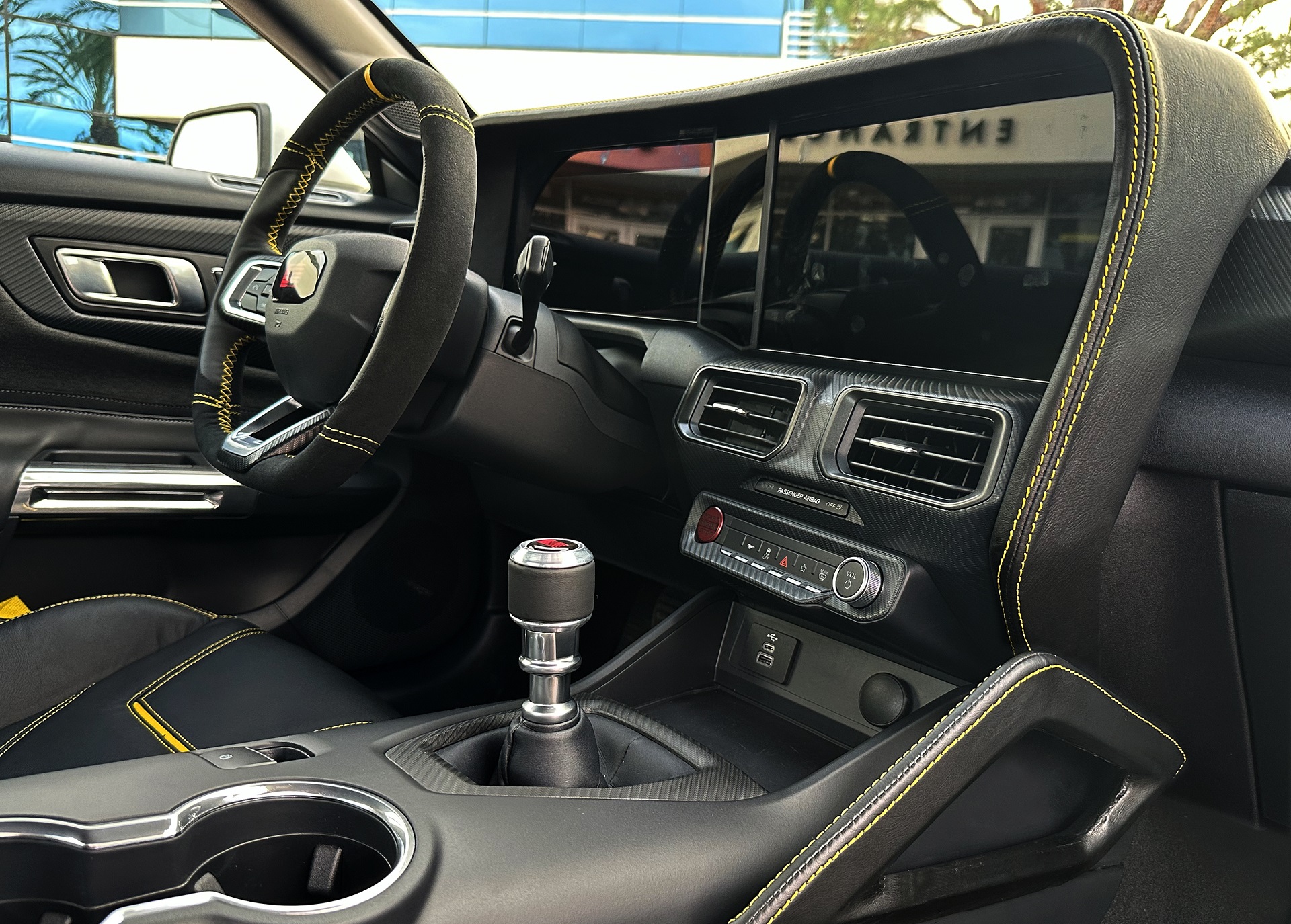 Niestety, podobnie jak Mustanga, S302 dopadła ciężka przypadłość jaką jest ekranoza. Domniemaną przyczyną tej strasznej choroby jest chęć cięcia kosztów produkcji, nadmierna fascynacja minimalizmem i uzależnienie od przyklejania interaktywnych płyt nagrobnych do deski rozdzielczej. Na szczęście, tutaj również Saleen stara się łatać błędy Forda i podejmuje próbę wpasowania ekranów w resztę deski za pomocą dodatkowej ramki. Pozostałe różnice to „rączaka dla pasażera i inne obszycie. Nie powiedziałbym, żeby było świetnie, ale nie o wnętrze tutaj chodzi.