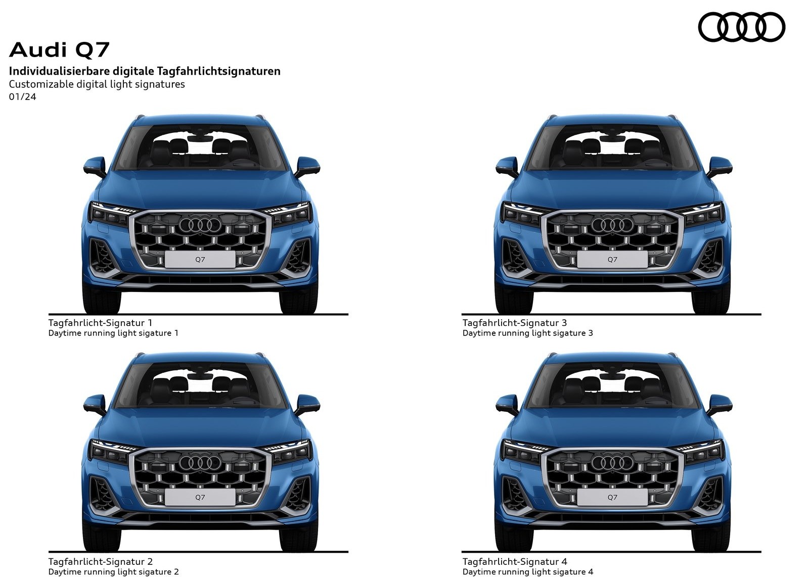 Największe zmiany zaszły w przedniej części nadwozia. Standardowo u Audi otrzymaliśmy jeszcze większą iterację Single Frame z nowym wypełnieniem składającym się z heksagonalnych wzorów, otoczonym szeroką, chromowaną obwódką. Do kompletu jest ostrzejszy wlot u dołu zderzaka i zmodyfikowane wloty boczne. Nowe reflektory, podobnie jak wcześniej styczne do środkowego wlotu, można poznać na pierwszy rzut oka po innym umieszczeniu i wzorze świateł do jazdy dziennej. W topowej wersji SQ7 światła do jazdy dziennej zyskują boczne pionowe paski nadające reflektorom dynamiki.