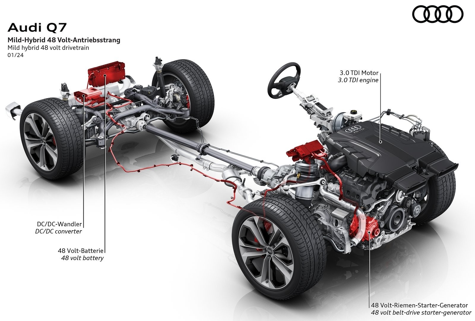 Pod maską nowości brak, tj. do wyboru mamy sprawdzone 3-litrowe, 6-cylindrowe odmiany 45TDI, 50TDI oraz 55TFSI, o mocach odpowiednio 231, 286 i 340 koni. Każdy wspomagany jest przez 48-woltową instalację miękkiej hybrydy i każdy z nich wystarczy do ciągnięcia 3,5-tonowej przyczepy. Na szczycie oferty znajdziemy model SQ7 z 4-litrową V-ósemką TFSI generującą 507 KM oraz 770 Nm. Niektórzy zapewne kojarzą, że SQ7 niegdyś oferowane było jako diesel, ale w 2020 r. produkcja takiego wariantu się zakończyła, a 435-konny ropniak został zastąpiony przez jednostkę benzynową.
