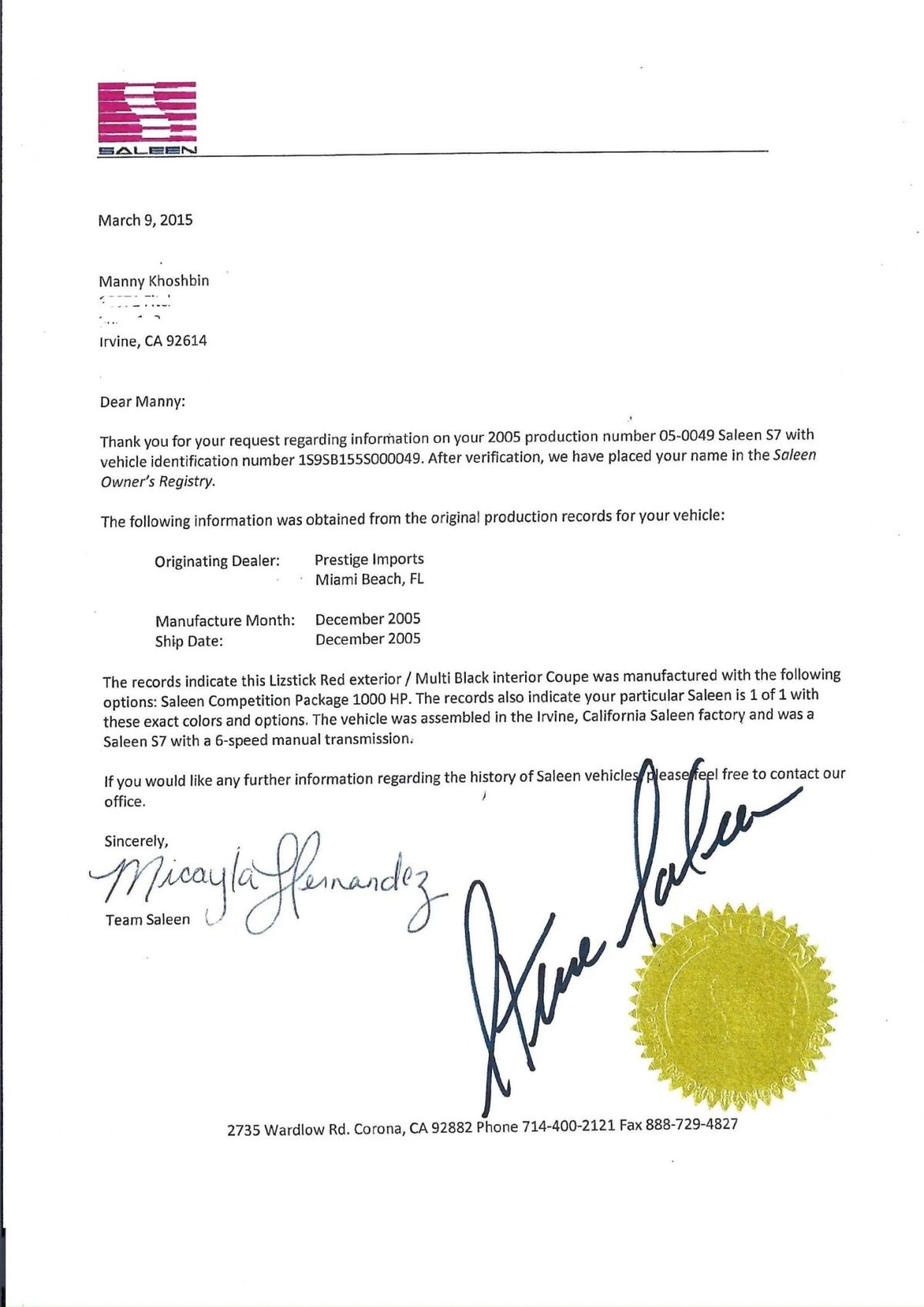 Warto wspomnieć, że firma Saleen potwierdziła na piśmie, że egzemplarz o nadwoziu 05-0049 to jedyny wyprodukowany Saleen S7 Twin Turbo Competition Package, którego zamówiono w takiej specyfikacji (w tym kolorze i z takim wyposażeniem).