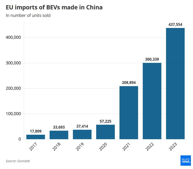 Skala importu chińskich samochodów elektrycznych na przestrzeni ostatnich kilku lat. / grafika: Eurostat/Euro News