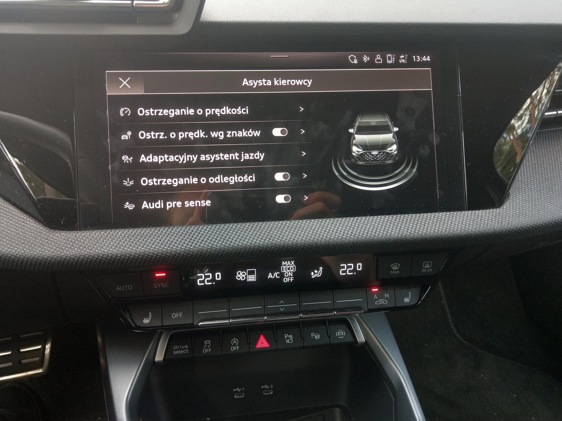 Tak, tak, cyfrowe zegary, sporo funkcji obsługiwanych z centralnego ekranu, „techniczna” stylistyka – to wszystko prawda. Tylko że ekran wbrew obecnym trendom jest całkowicie wkomponowany w deskę rozdzielczą, a poza nim ostało się trochę przycisków, w tym te odpowiadające za obsługę klimatyzacji, za co plus dla Audi. Co prawda cały rządek wygląda tak samo, ale to i tak znacznie lepsze niż dotykowe paski w pokrewnym Golfie. Poniżej jest też kilka przycisków związanych głównie z systemami wspomagającymi – tryb jazdy, kontrola trakcji (wątpię, że całkiem ją wyłącza), system start-stop, światła awaryjne (to akurat łatwo zgadnąć), czujniki parkowania i kamera, asystent parkowania i ogólny skrót do menu asyst kierowcy – przydatny, gdy chcemy choćby wyłączyć pikanie przy przekroczeniu prędkości. Nie żebym zachęcał do łamania przepisów, ale… o tym później, przy okazji pozostałych systemów.