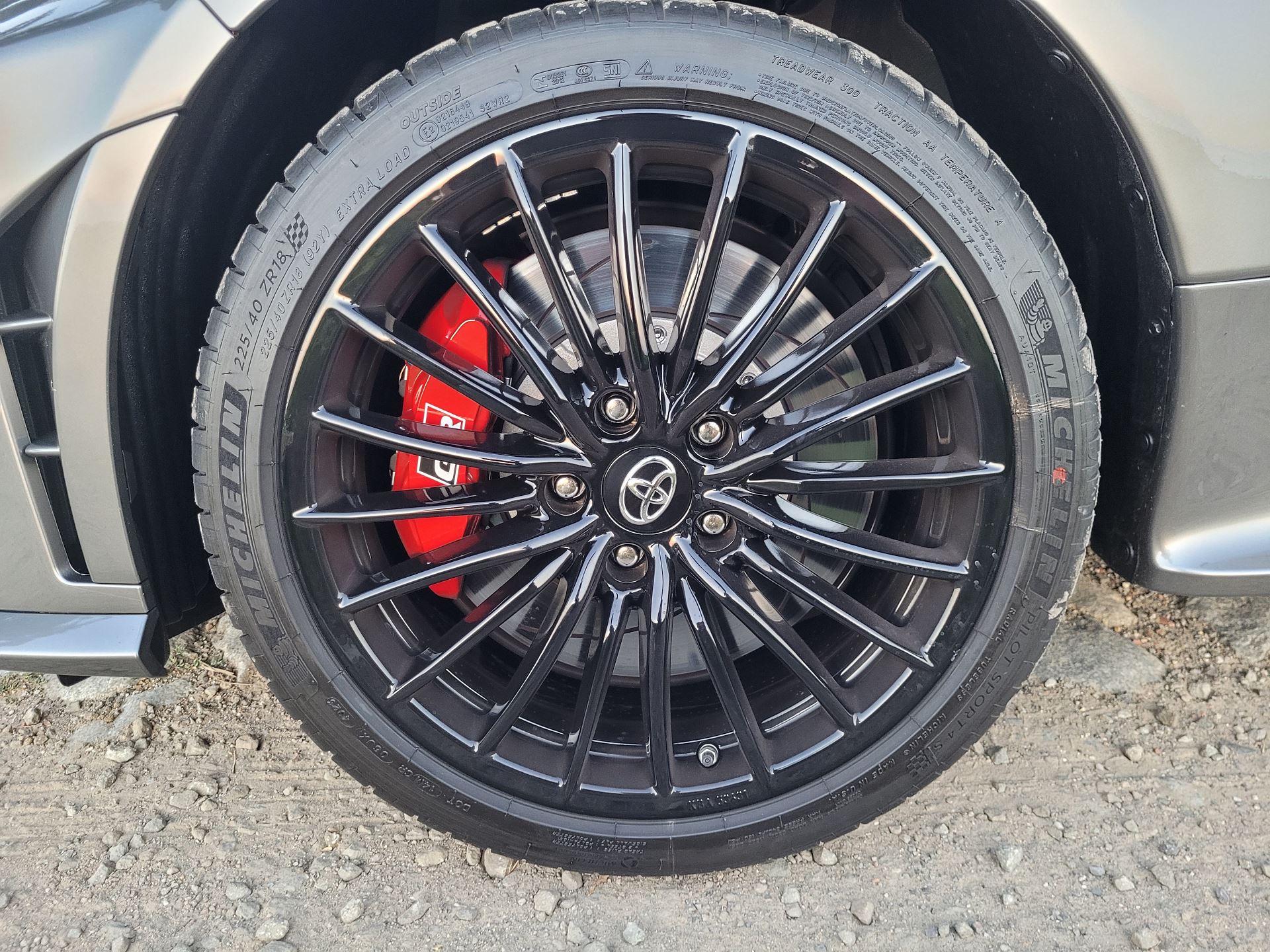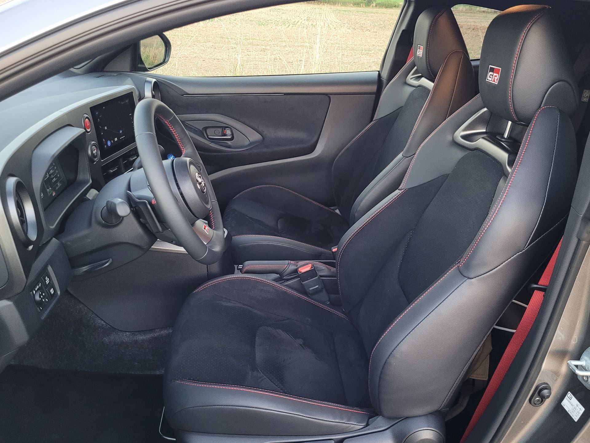 Układ korzysta z 14-calowych, nacinanych tarcz i 4-tłoczkowych zacisków z przodu oraz 11,7-calowych, również nacinanych tarcz i 2-tłoczkowych zacisków z tyłu. Heble są niesamowicie skuteczne i nawet jeśli nie korzysta się z ich 100 proc. skuteczności, to i tak są w stanie skłonić ogumienie Michelin Pilot Sport 4S do piszczenia na suchym jak pieprz i równym jak stół asfalcie. FastestLaps.com podpowiada, że już przedliftowy GR Yaris na wyhamowanie ze 100 km/h potrzebował 31,9 m (taki wynik uzyskał magazyn Auto Bild Sportscars w 2021 r.), co stanowi wynik na poziomie takich aut jak McLaren 675LT (31,8 m) czy Lamborghini Temerario (32 m) – polift na pewno nie jest gorszy.