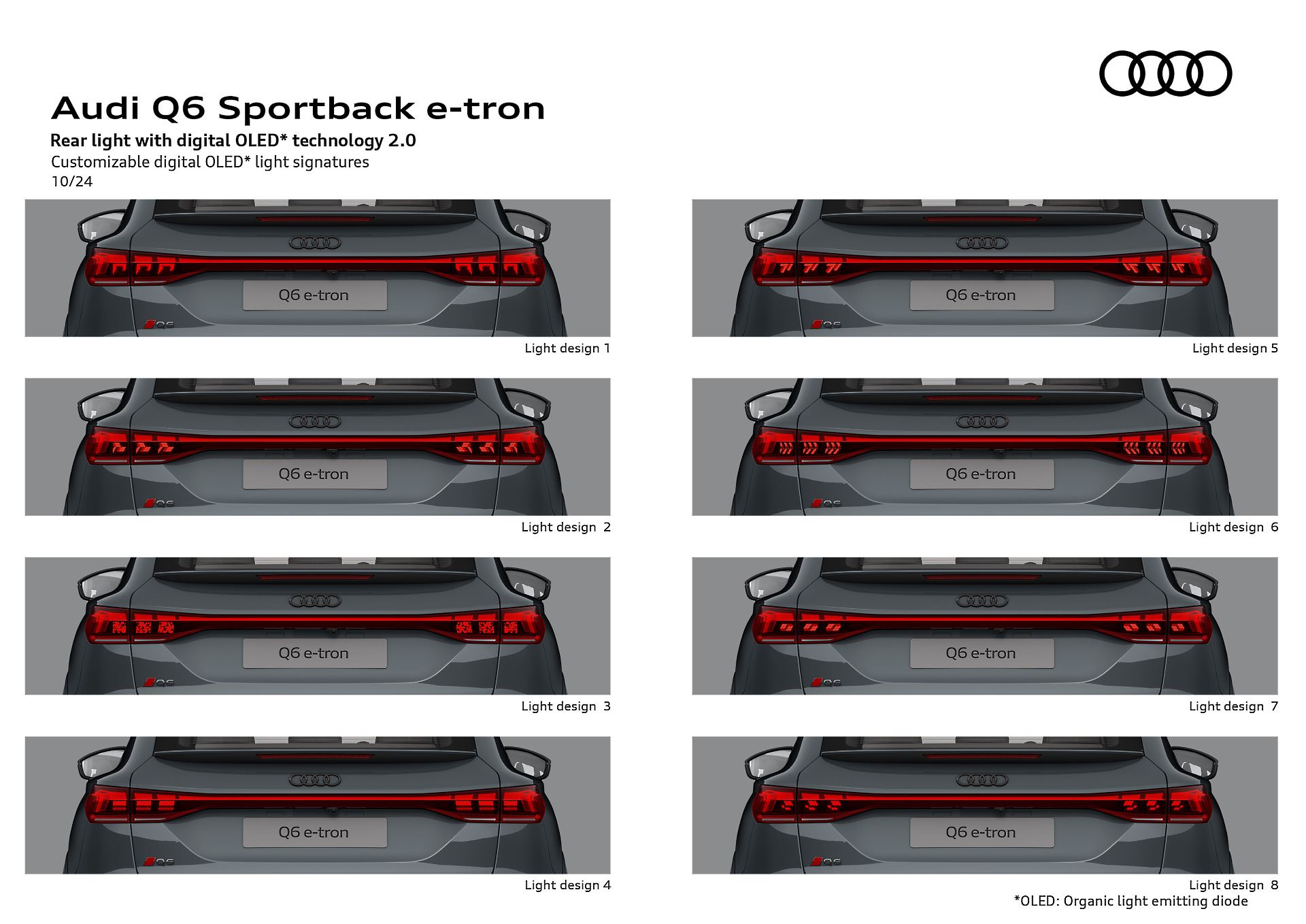 Audi Q6 i SQ6 Sportback e-tron korzystać mogą z matrycowych, diodowych reflektorów przednich oraz z OLED-owego oświetlenia z tyłu. To drugie jest szczególnie ciekawe, bowiem w razie wypadku czy awarii może wyświetlać określone obrazy (sygnaturę) z symbolami ostrzegawczymi. W opcji oferowany będzie wyświetlacz przezierny z funkcją tzw. rozszerzonej rzeczywistości. Z perspektywy kierowcy jego wskazania mają przekątną ok. 88 cali i mogą dawać wrażenie, że wskazania HUD-a znajdują się nawet ok. 200 m przed autem.