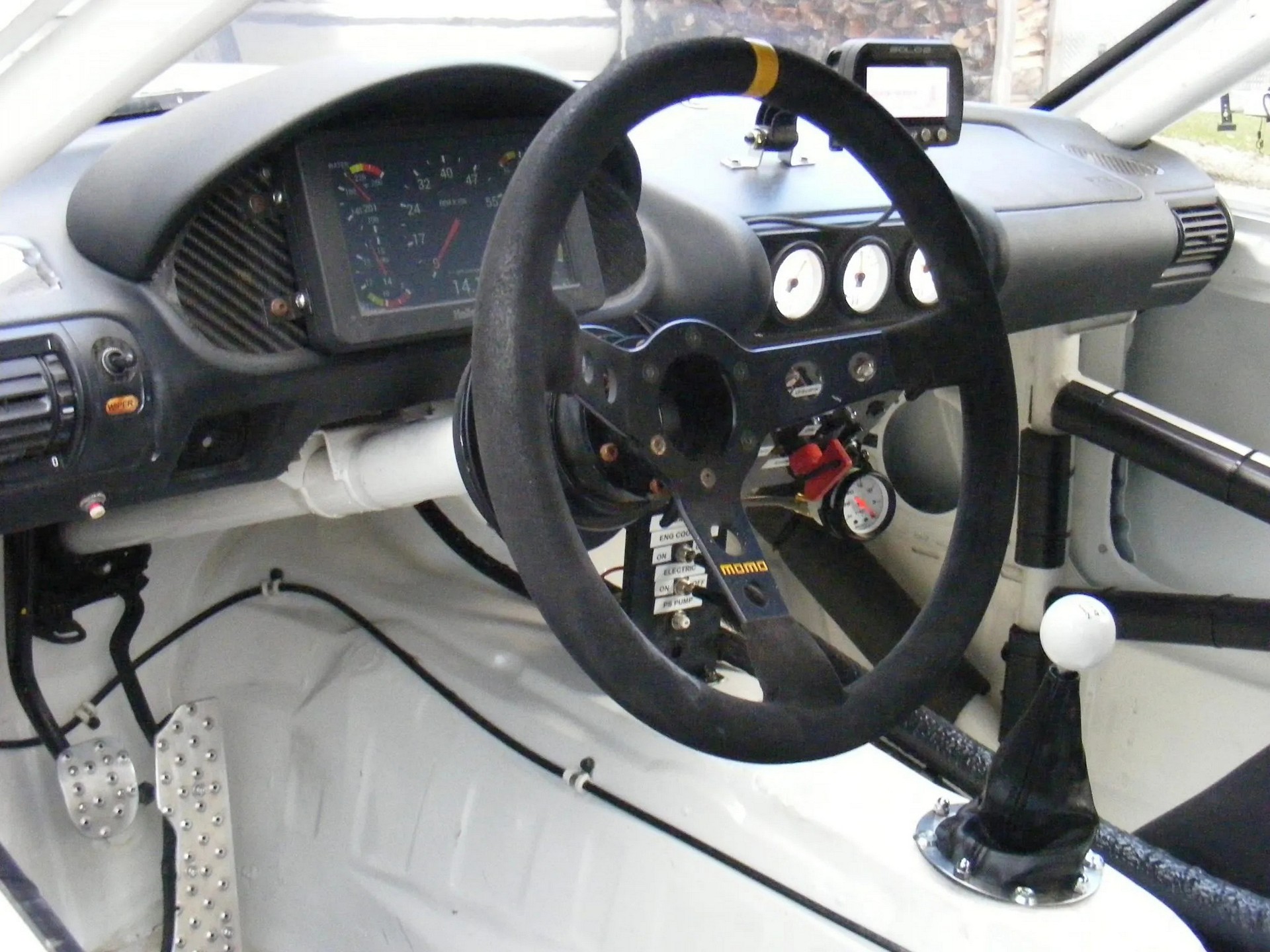 To, co widzimy na zdjęciach, to efekt rozebrania auta, wzmocnienia go dodatkowymi spoinami i wyposażenia w szereg elementów z włókna węglowego i aluminium, w tym nowa maska, skrzydło czy dyfuzor. Do kompletu są też szyby wymienione na odpowiedniki z poliwęglanu. Auto stoi na osiemnastocalowych kołach Team Dynamics Motosport, na które nałożono nowe opony Toyo Proxes RS1 w rozmiarze 245/540R16 (tu nie ma błędu, oznaczenia w tym formacie noszą opony przeznaczone do sportu).