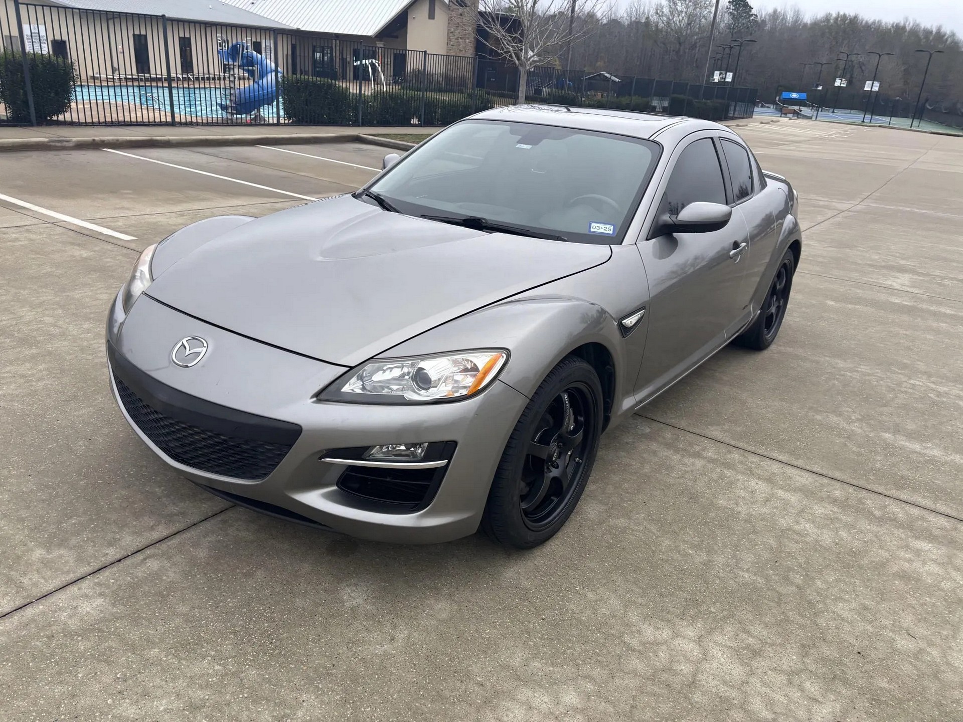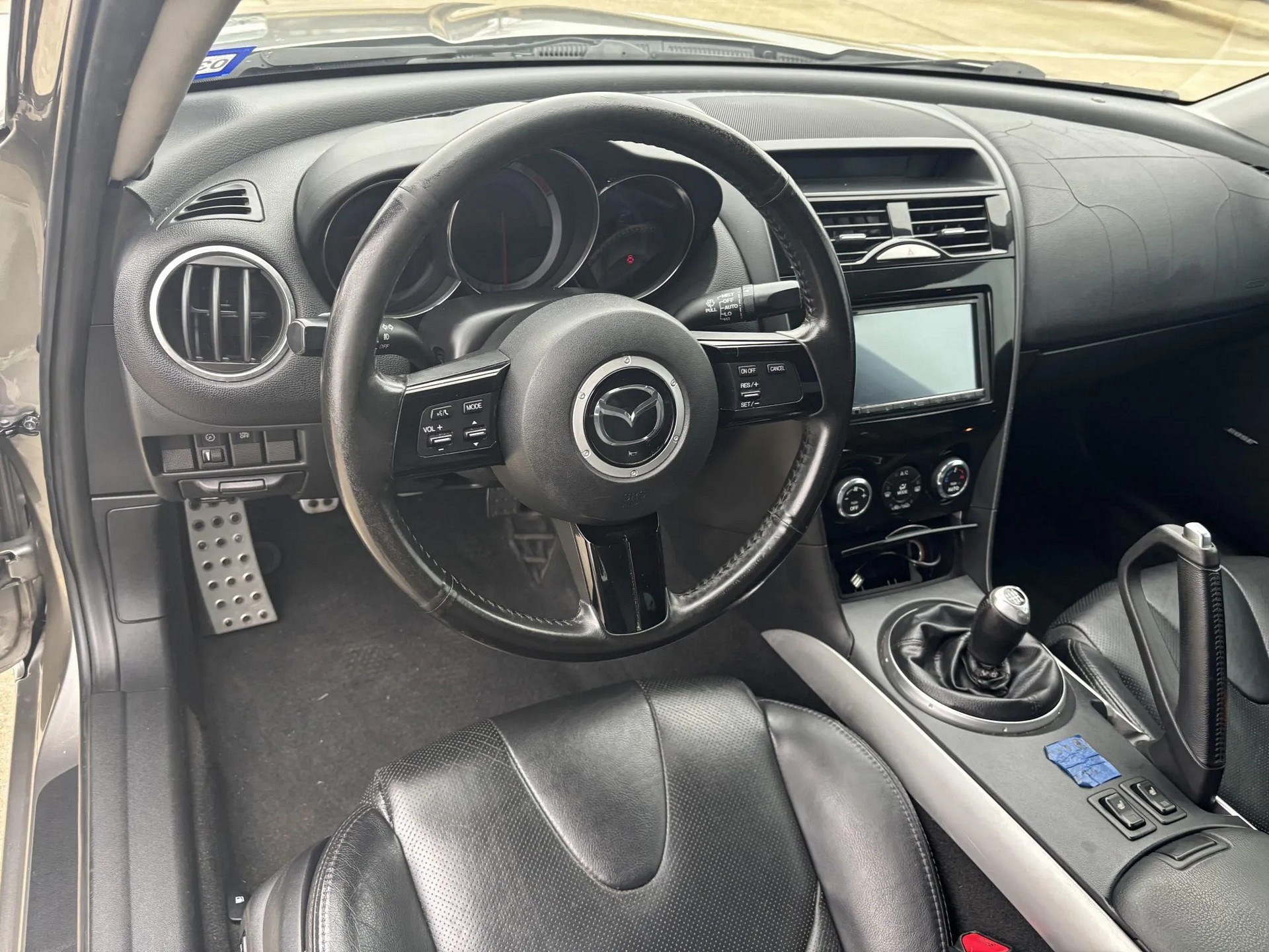 Wnętrze jest takie jak w większości egzemplarzy Mazdy RX-8, główną różnicą jest ekran dotykowy Kenwood z łącznością Android Auto i Apple CarPlay. Pomimo niewysokiego względnie przebiegu 58 tys. mil, widać ślady zużycia. Szczególnie mocno widoczna jest popękana pokrywa poduszki powietrznej pasażera.