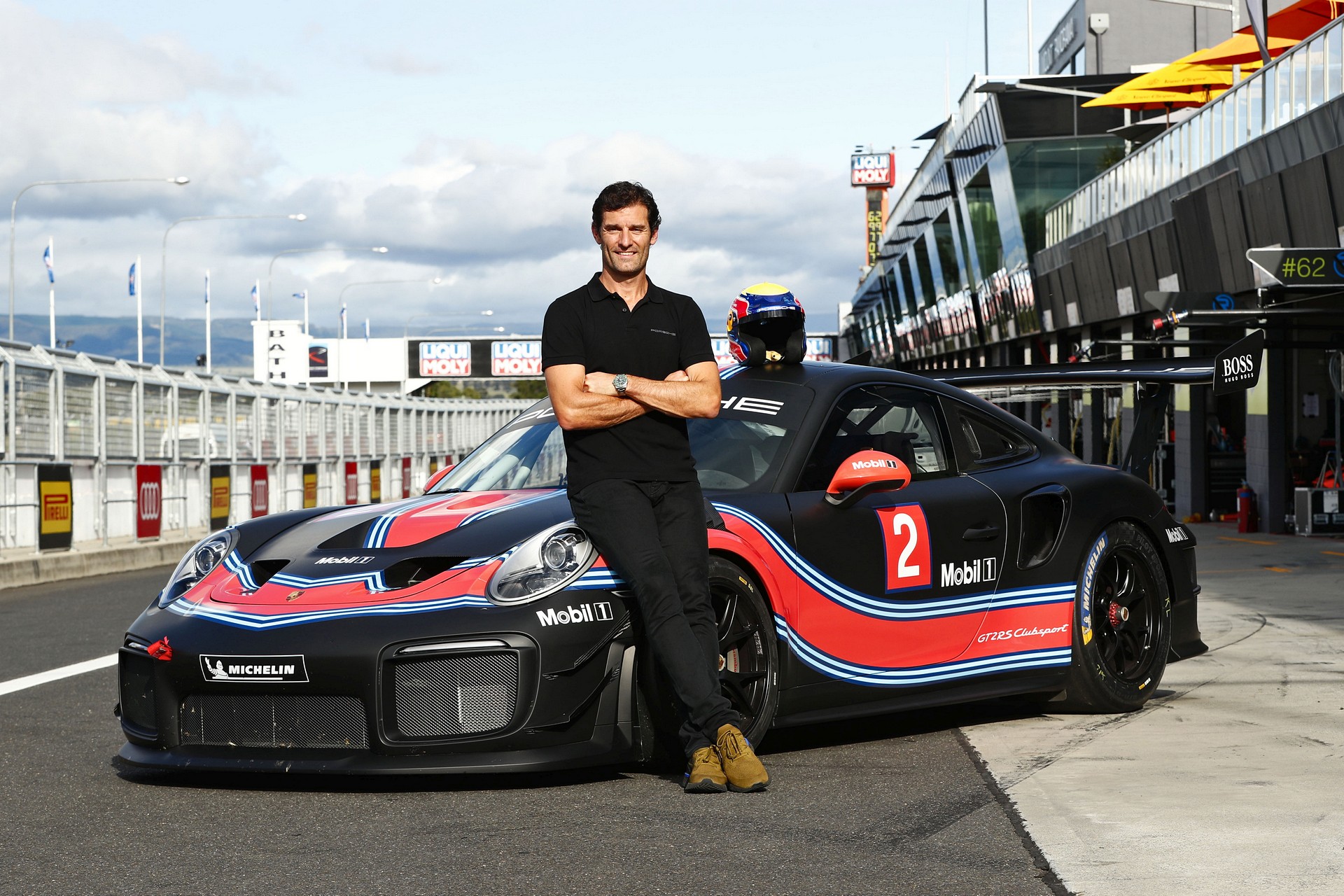 Porsche 911 GT2 RS Clubsport z 2018 roku, a przy nim Mark Webber, były kierowca F1, który obecnie współpracuje z Porsche.