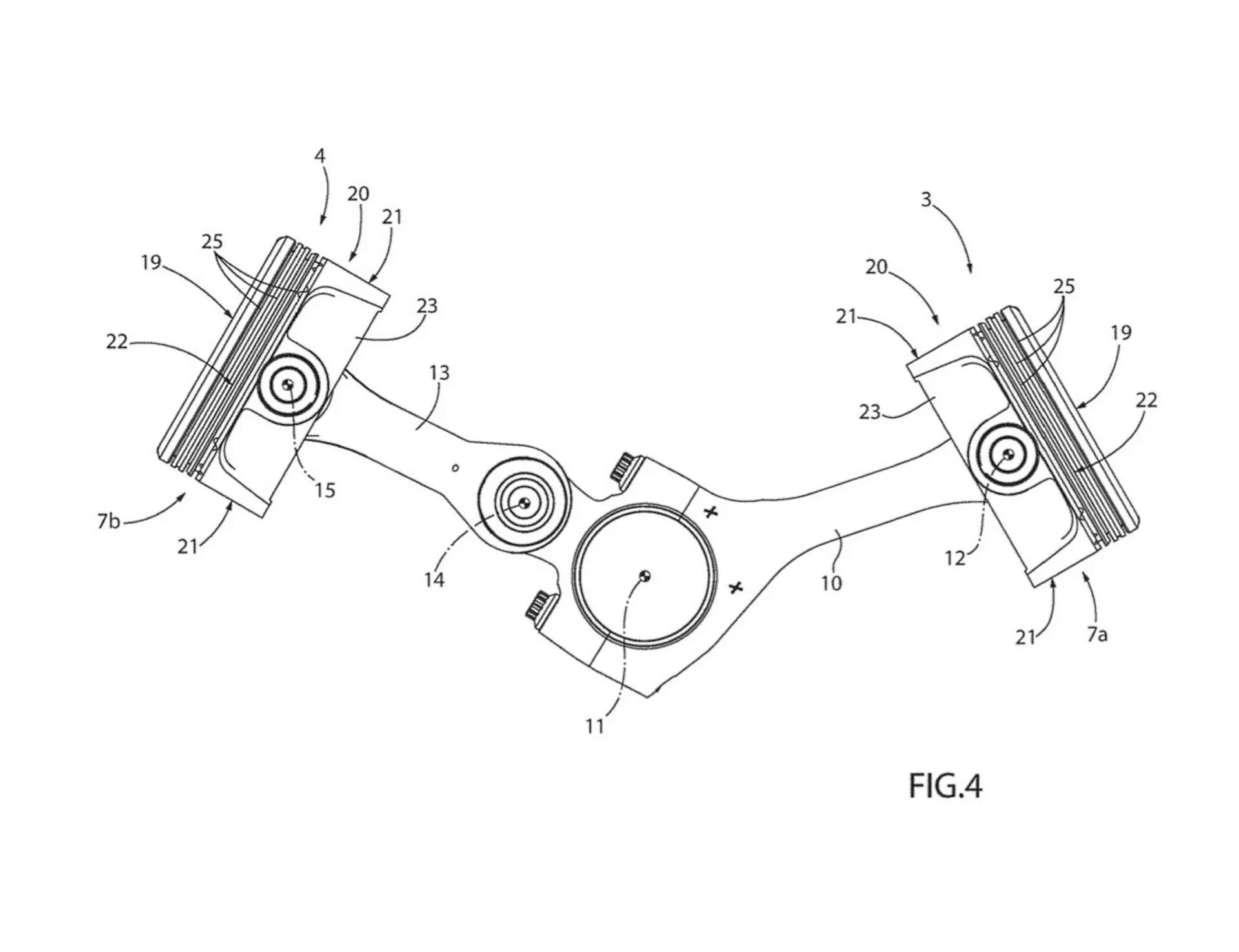 Ferrari podeszło do sprawy odwrotnie, i zachowało równe umieszczenie, za to, patrząc wzdłuż rzędu – skróciło i rozszerzyło kształt cylindrów. Efekt jest ten sam – krótszy, ale szerszy rząd przy tej samej pojemności. Jakby tego było mało, patent Włochów zawiera jeszcze jeden pomysł na redukcję długości silnika. Jeśli kiedyś przyglądaliście się blokowi czy układowi korbowemu dowolnego silnika widlastego czy też boksera, to zapewne zauważyliście, że rzędy cylindrów są lekko przesunięte względem siebie. Wynika to oczywiście z tego, że trudno byłoby podłączyć dwa korbowody – które przecież muszą poruszać się niezależnie – do tego samego miejsca wału korbowego.