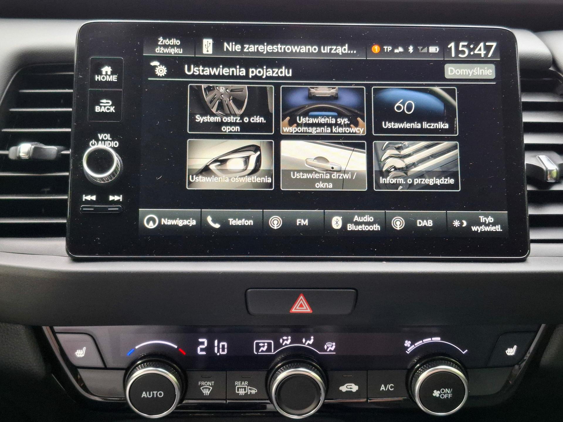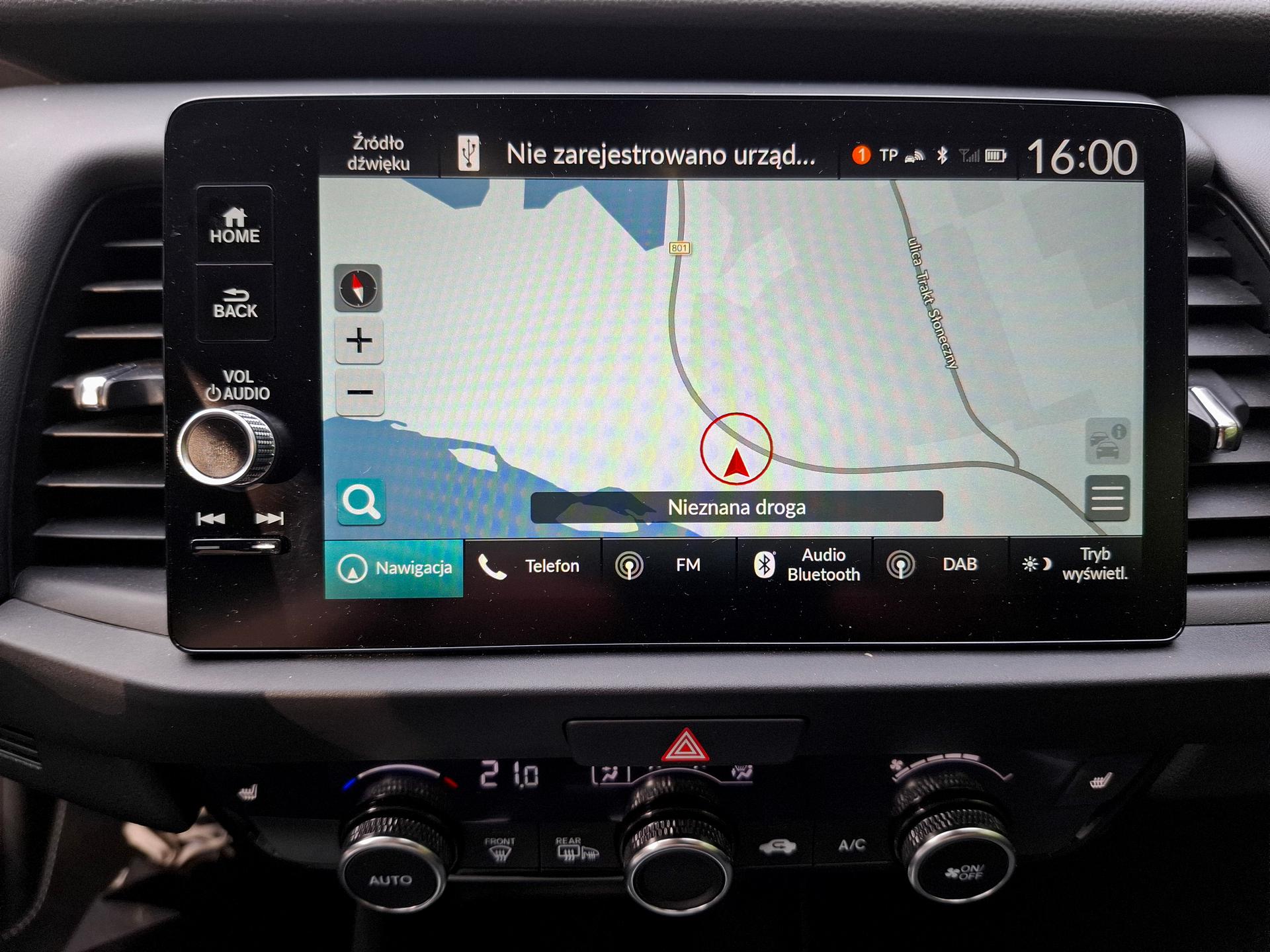 Są to zresztą kolejne elementy, których obecności człowiek w wieku działkowo-grzybowym nawet nie zauważy. Jednak hasło „nowoczesność w domu i zagrodzie” jest niezmiennie aktualne, więc i takie systemy musiały się tu znaleźć. Miałem okazję sprawdzić funkcjonowanie pierwszego z nich – i ten po prostu działa, ale nie bez zastrzeżeń. Android Auto, jak w większości innych wyposażonych weń samochodów, wymaga podpięcia telefonu przez kabel USB. Połączenie następuje wtedy szybko a całość działa płynnie. Można wtedy np. używać ekranu do korzystania z nawigacji Google – nieporównywalnie lepszej od garminowskiej, seryjnie instalowanej w Jazzie.